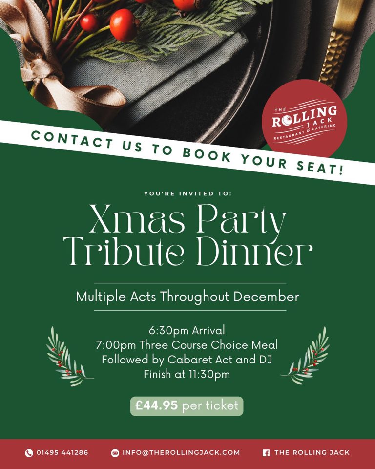 Celebrate the festive season in style with our Xmas Party Tribute Dinner! Enjoy a delicious meal and be entertained by multiple tribute acts performing throughout December. Perfect for work parties, family get-togethers, and festive nights out!